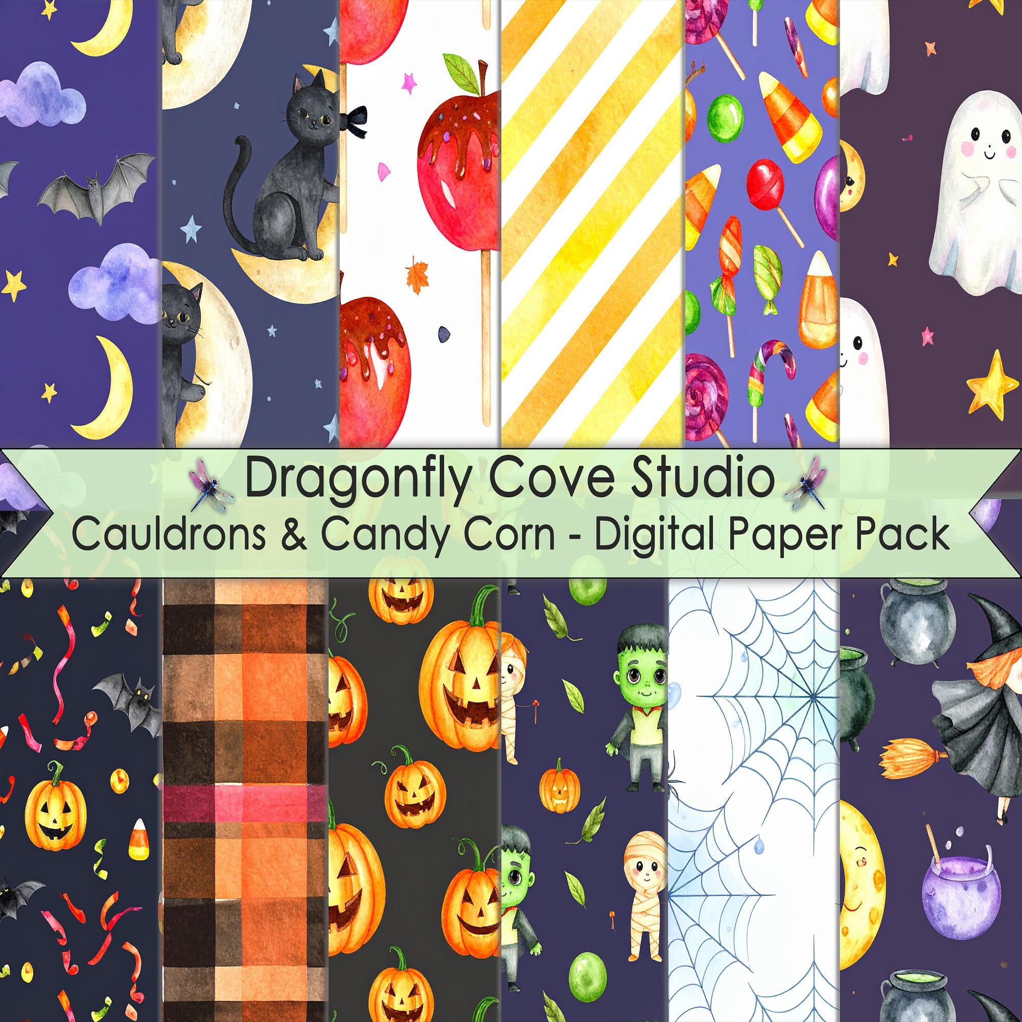 Digital Paper Pack – 6x6 Inch Cauldrons & Candy Corn PNG Backgrounds for Scrapbooking + Crafts