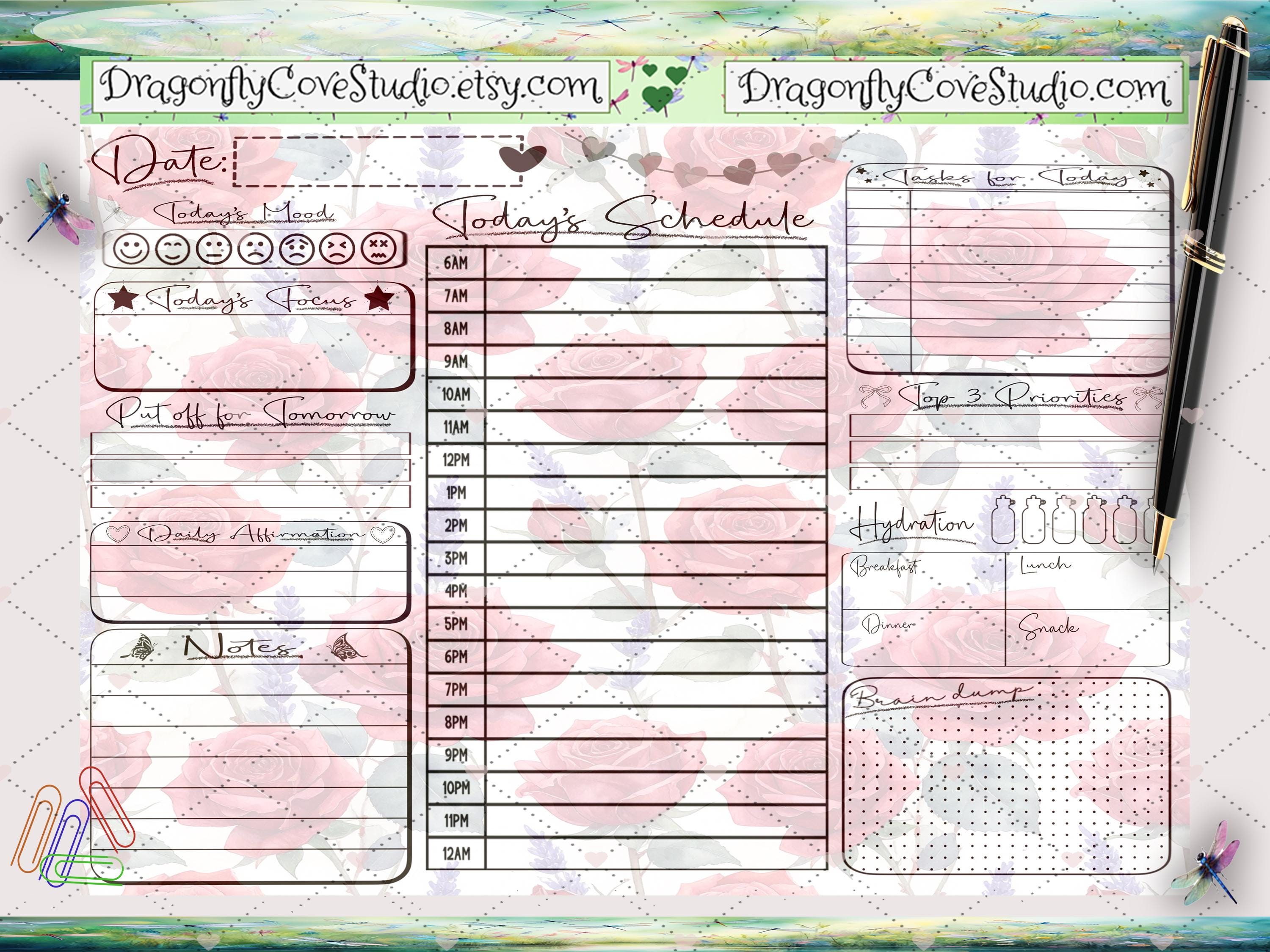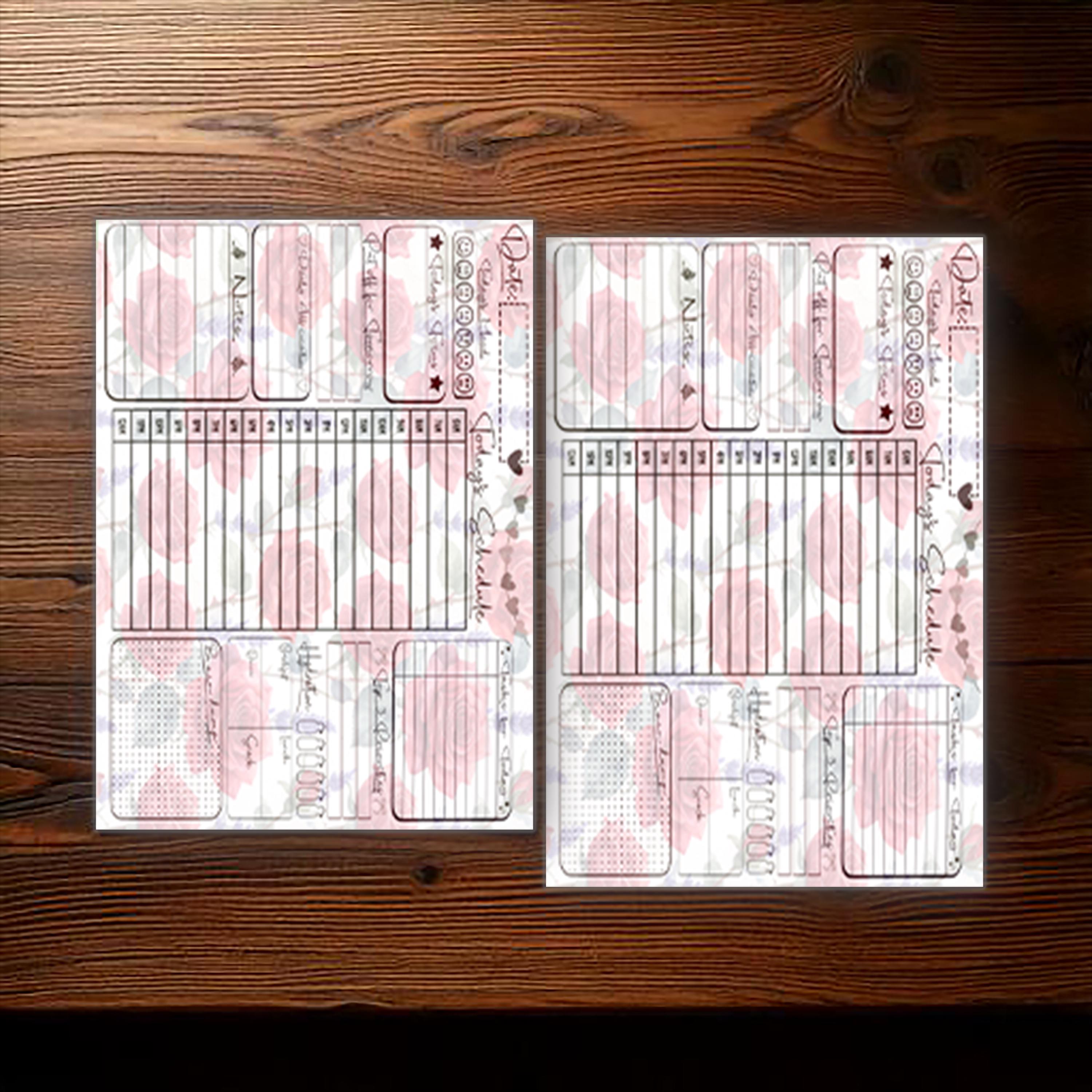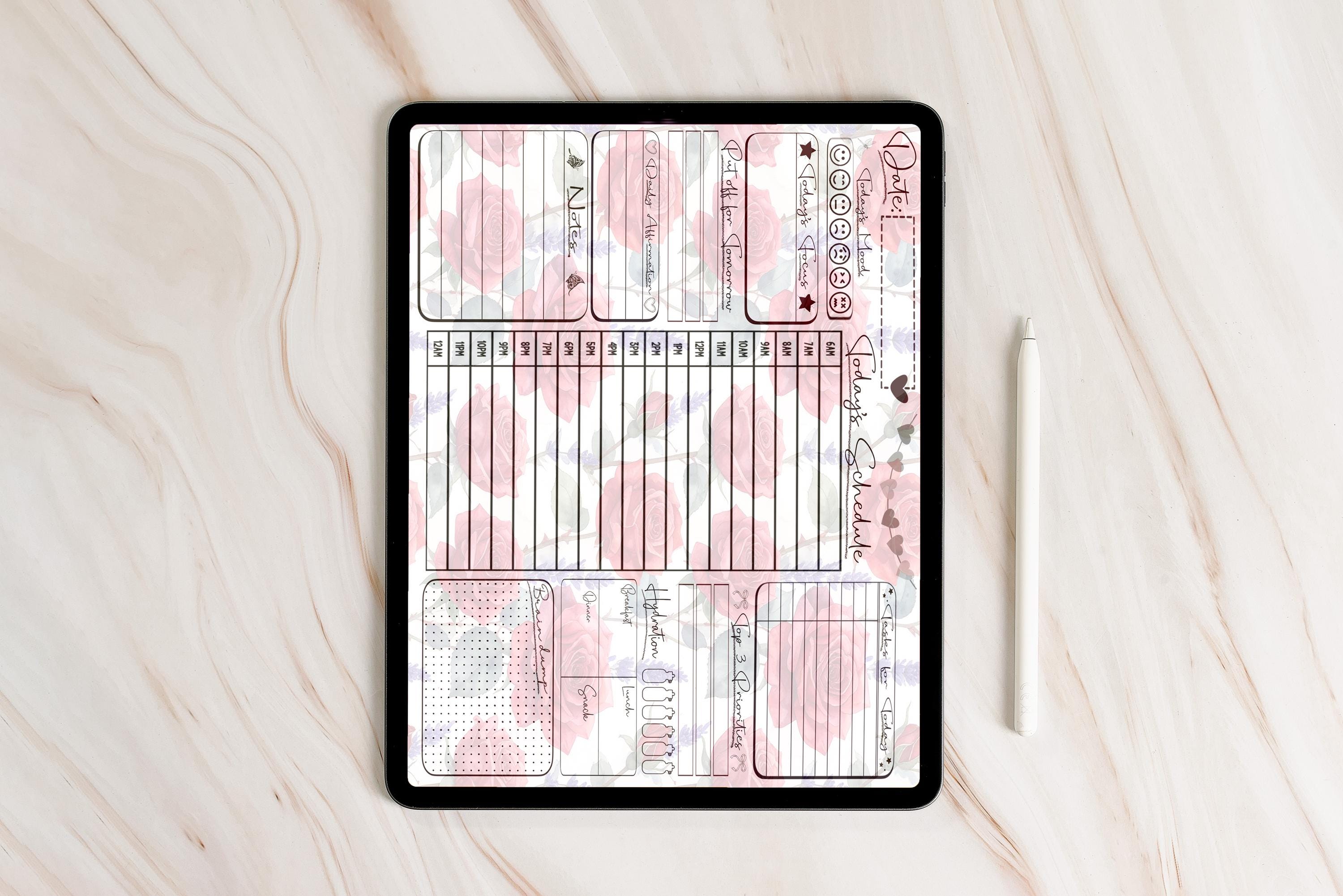 Each page includes space for mood tracking, priorities, hydration, meals, schedule blocks, and daily tasks, giving you a beautifully structured daily layout while maintaining a soft, romantic feel.