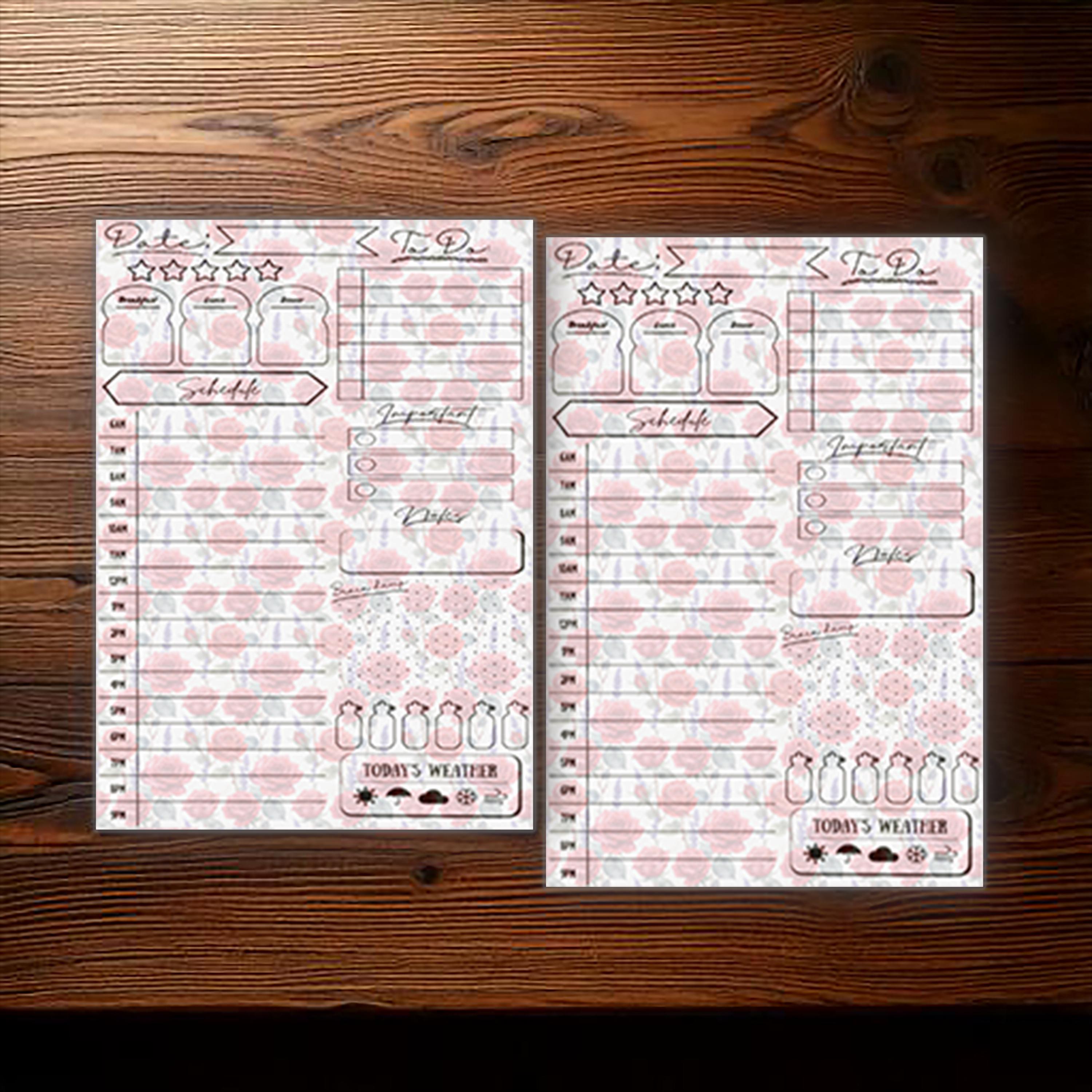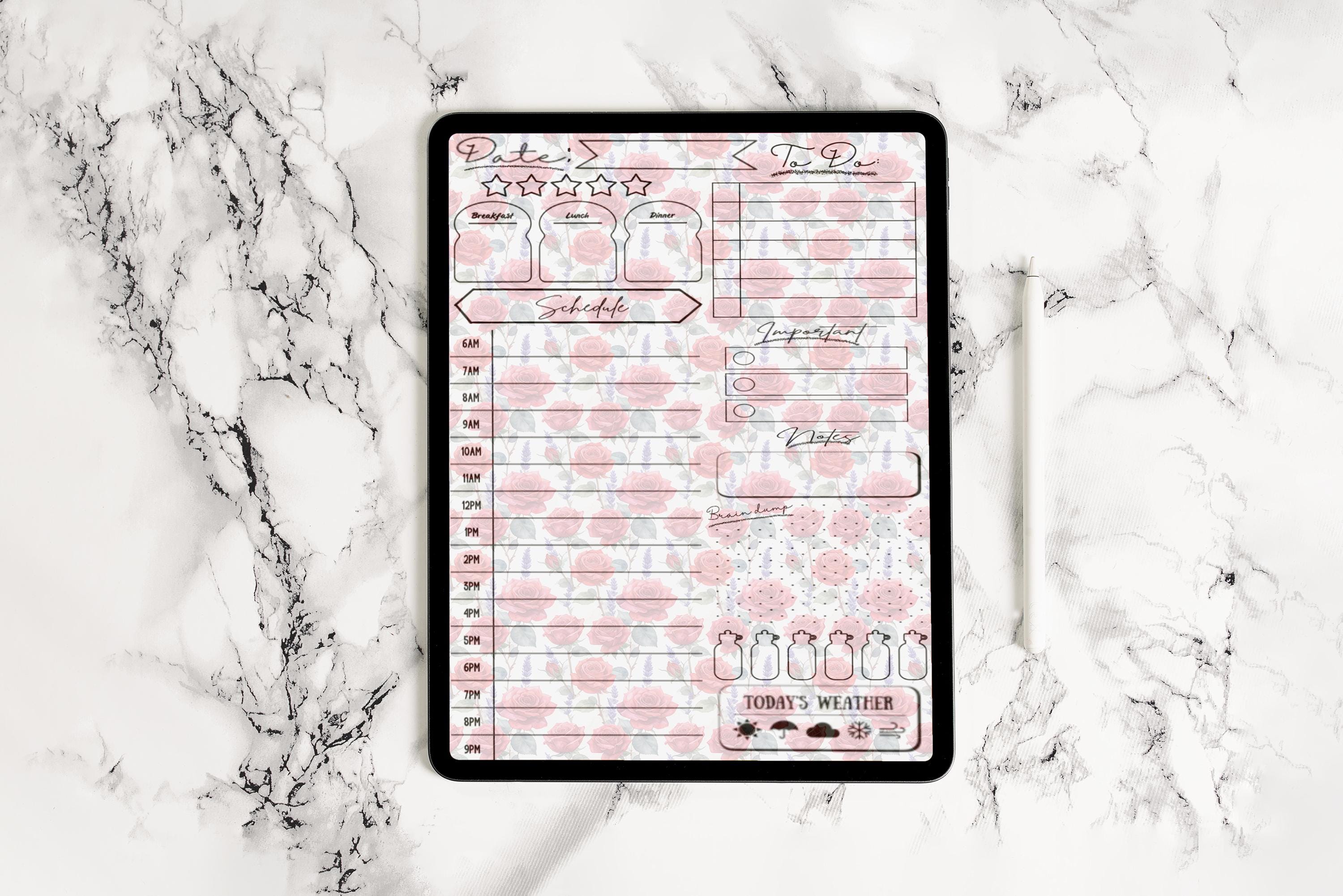 Each page includes space for mood tracking, priorities, hydration, meals, schedule blocks, and daily tasks, giving you a beautifully structured daily layout while maintaining a soft, romantic feel.