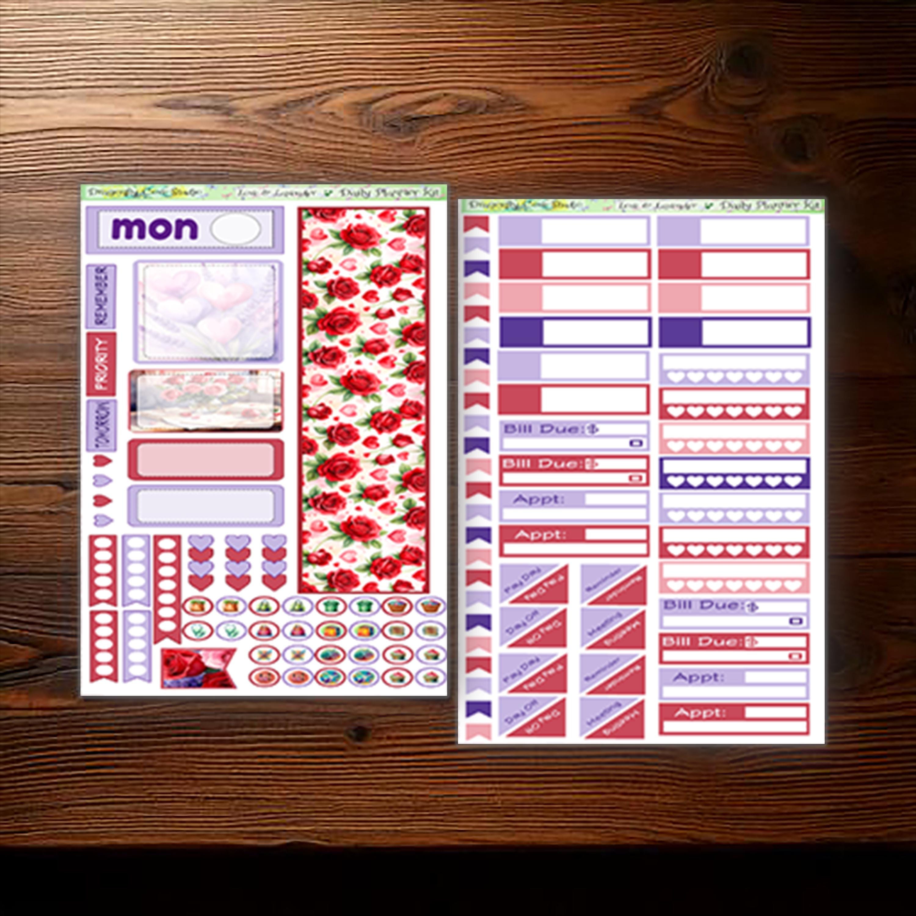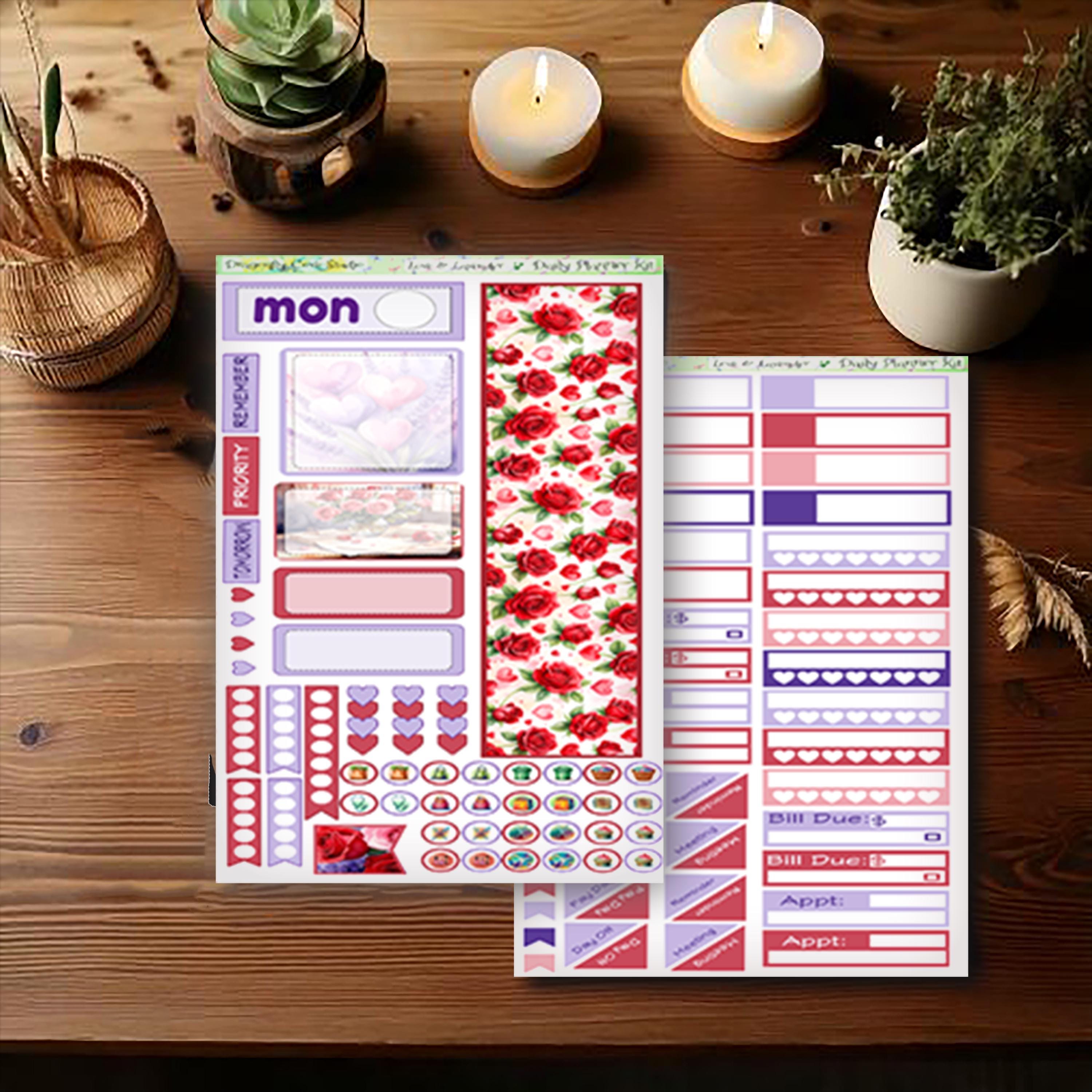 Each daily page includes a balanced mix of functional stickers and Love & Lavender–themed decorative elements, giving you structure where you need it and creative freedom where you want it. Soft lavender tones, romantic florals, and Valentine-inspired details add warmth and visual interest while still leaving room for writing, journaling, and daily reflection.