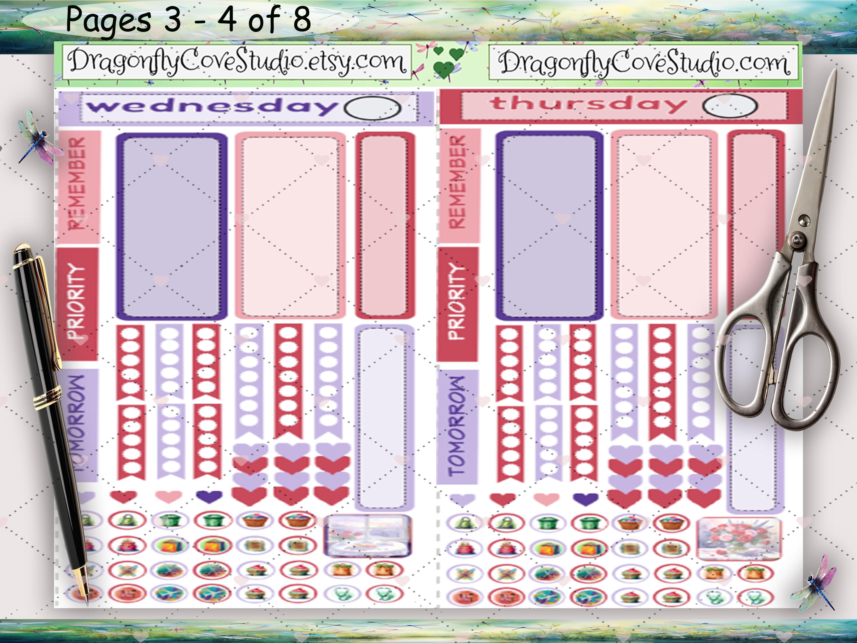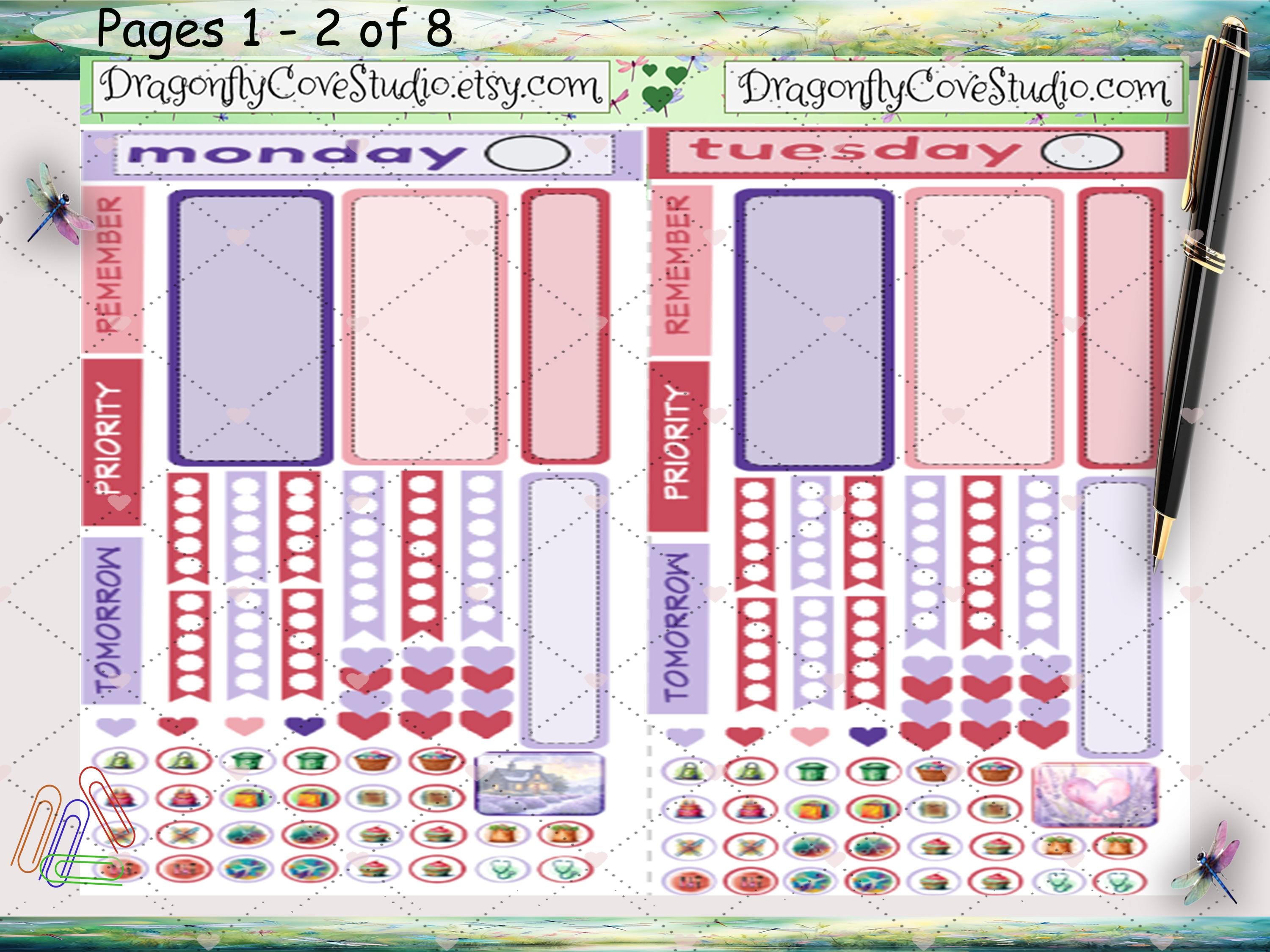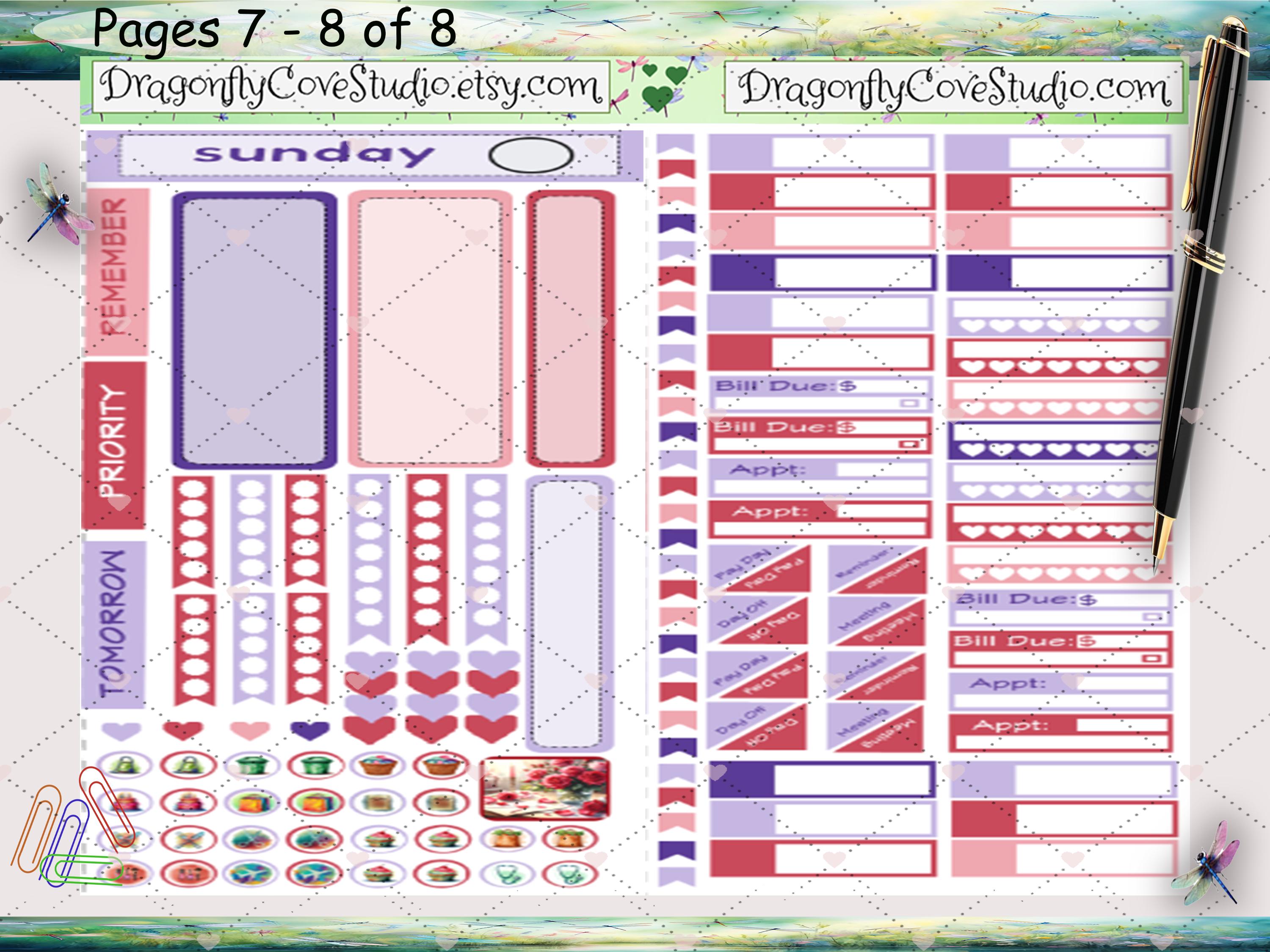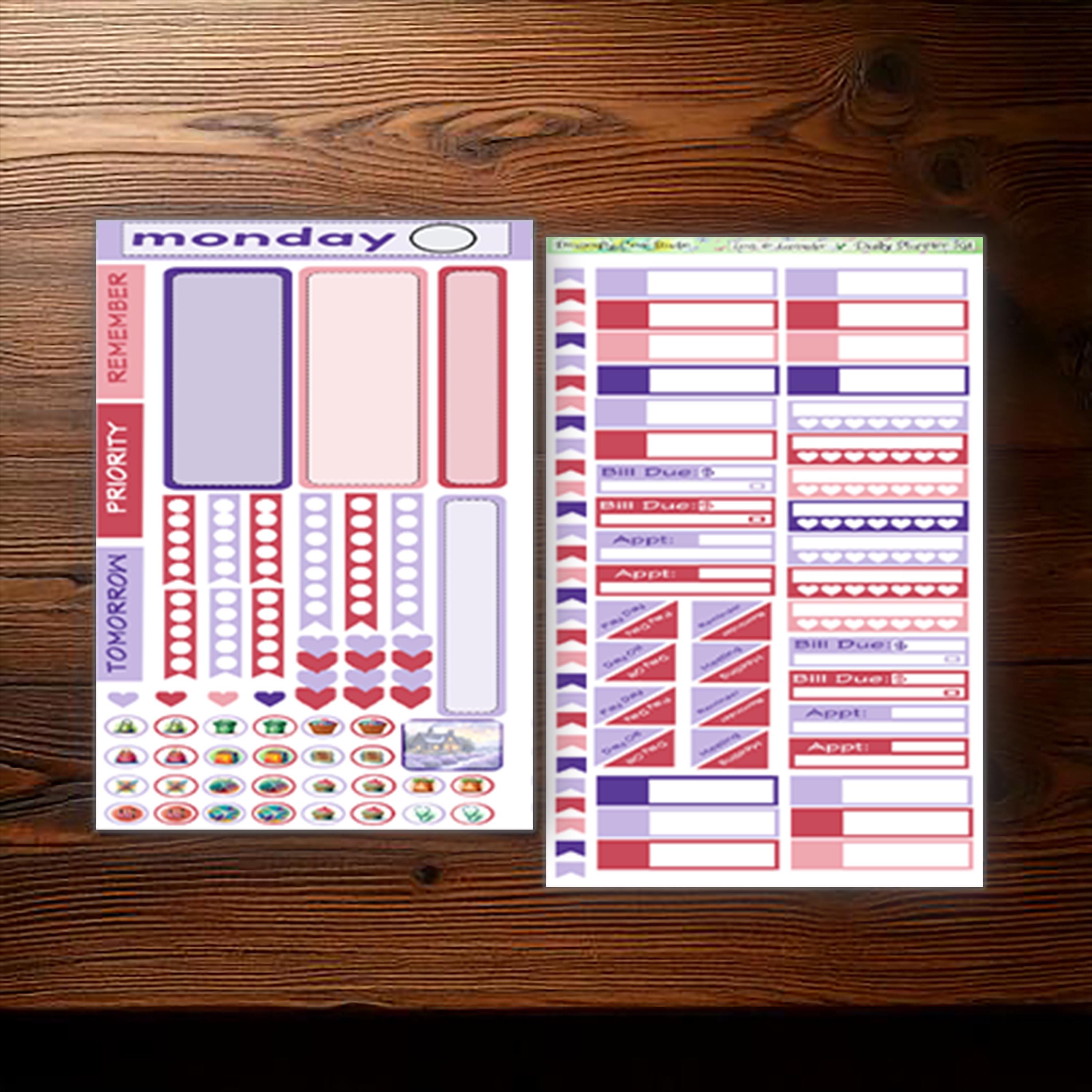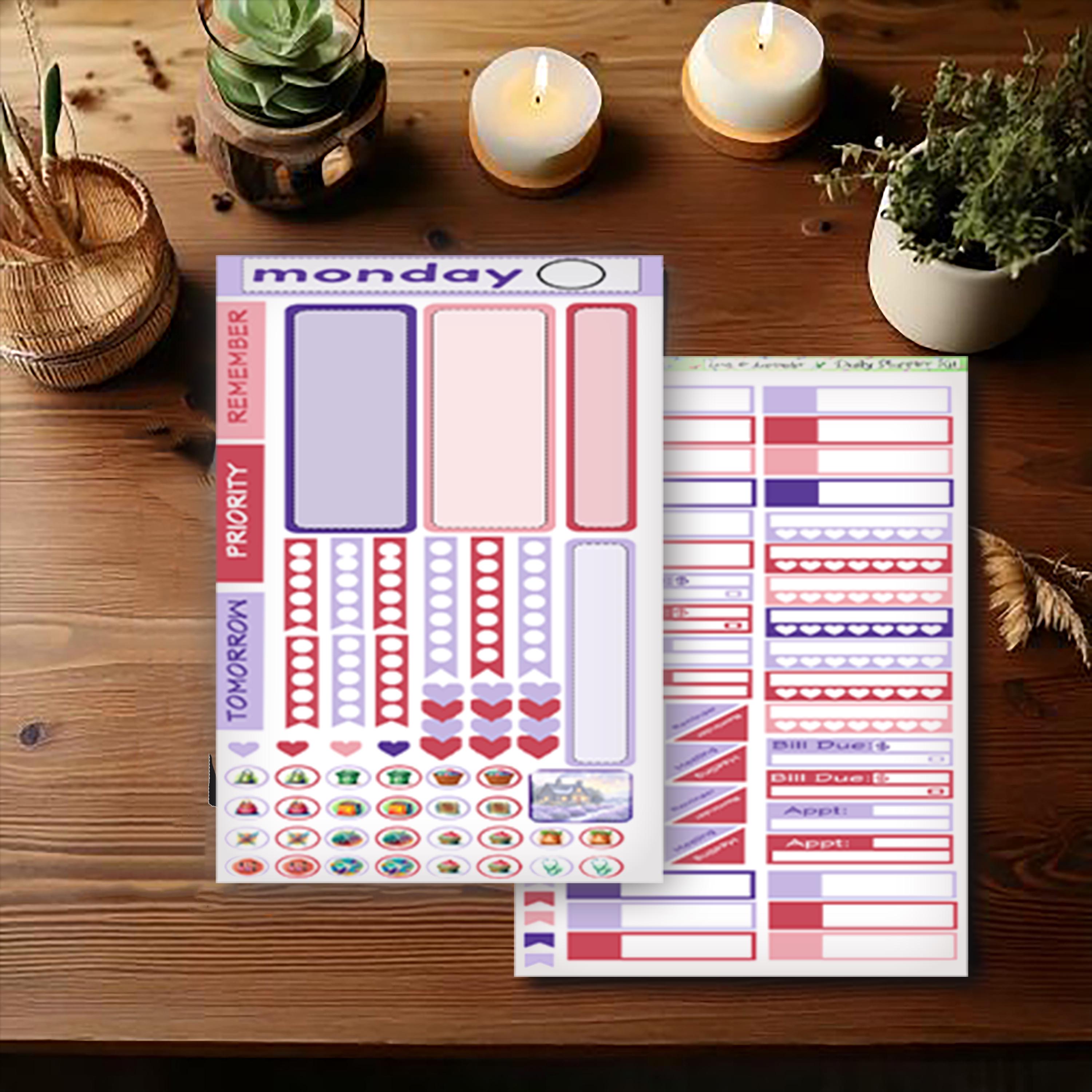 Each daily sheet includes a thoughtful blend of functional stickers and Love & Lavender–themed decorative elements, making it easy to plan tasks, highlight priorities, and add visual interest without crowding the page. Soft lavender tones, romantic florals, and Valentine-inspired details bring warmth and cohesion to your daily planning while keeping layouts flexible and easy to use.