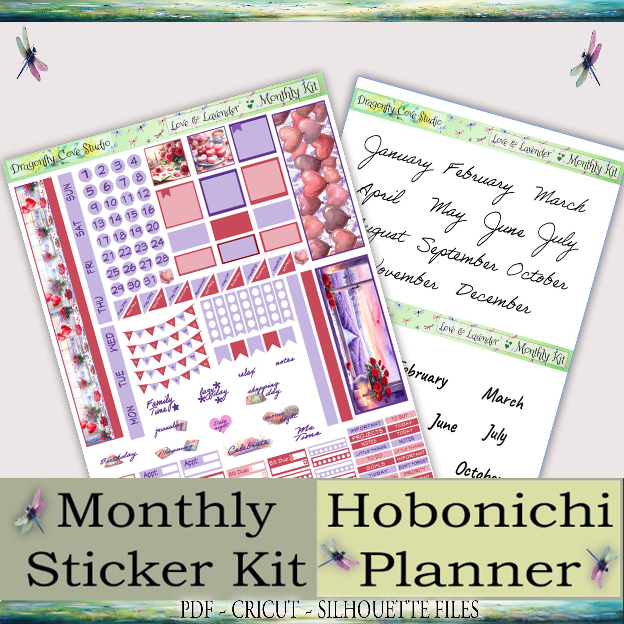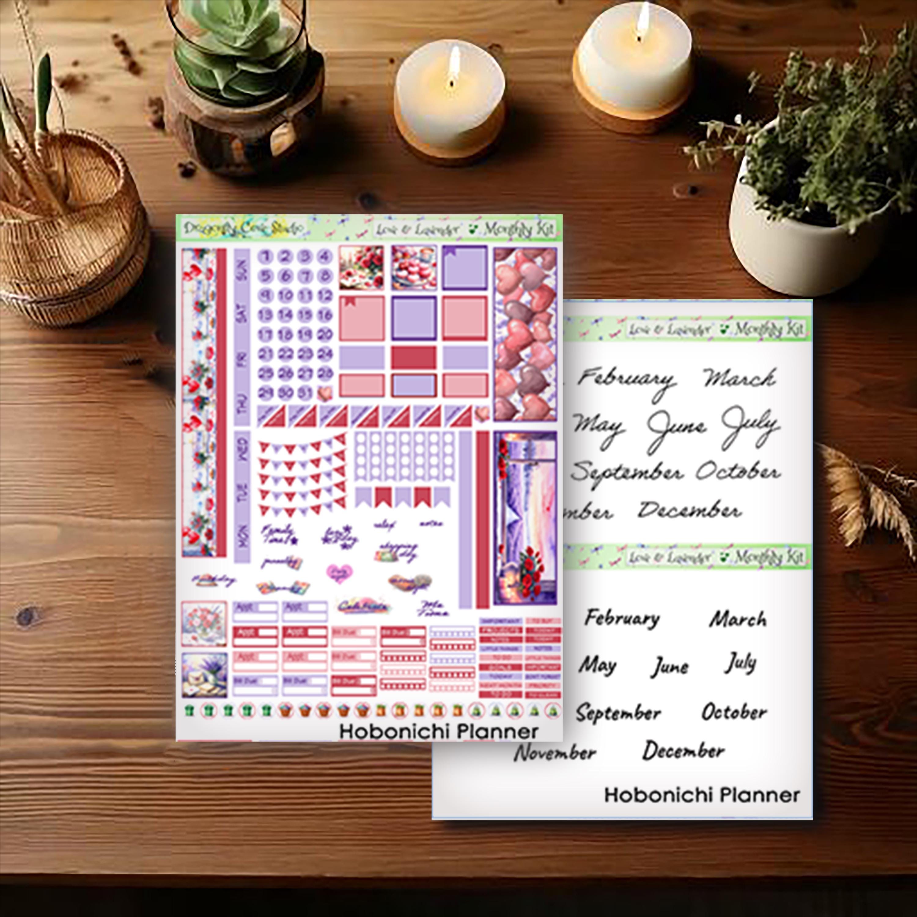 Hobonichi Planner Stickers: Love & Lavender Monthly Kit (PDF, PNG, Silhouette Files)