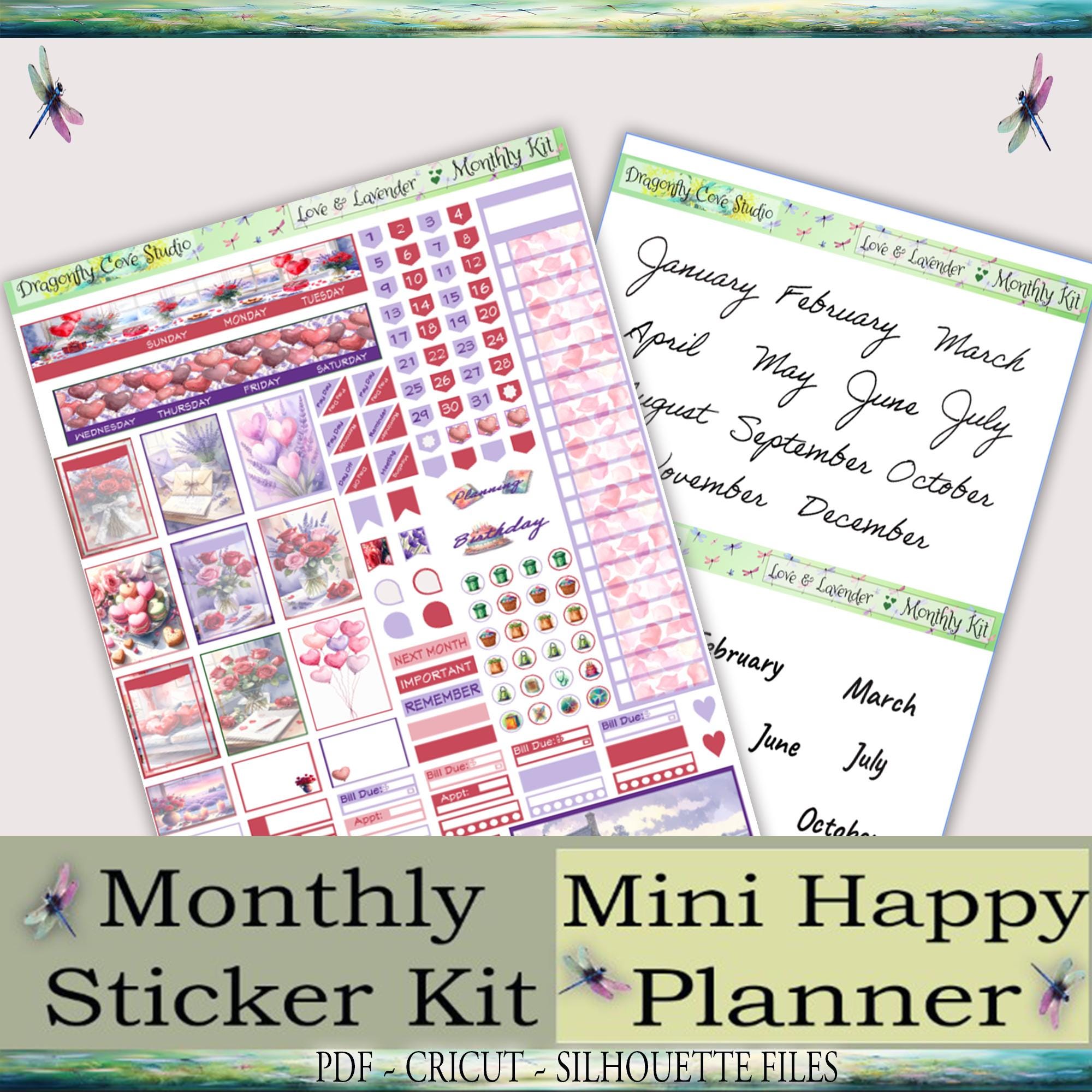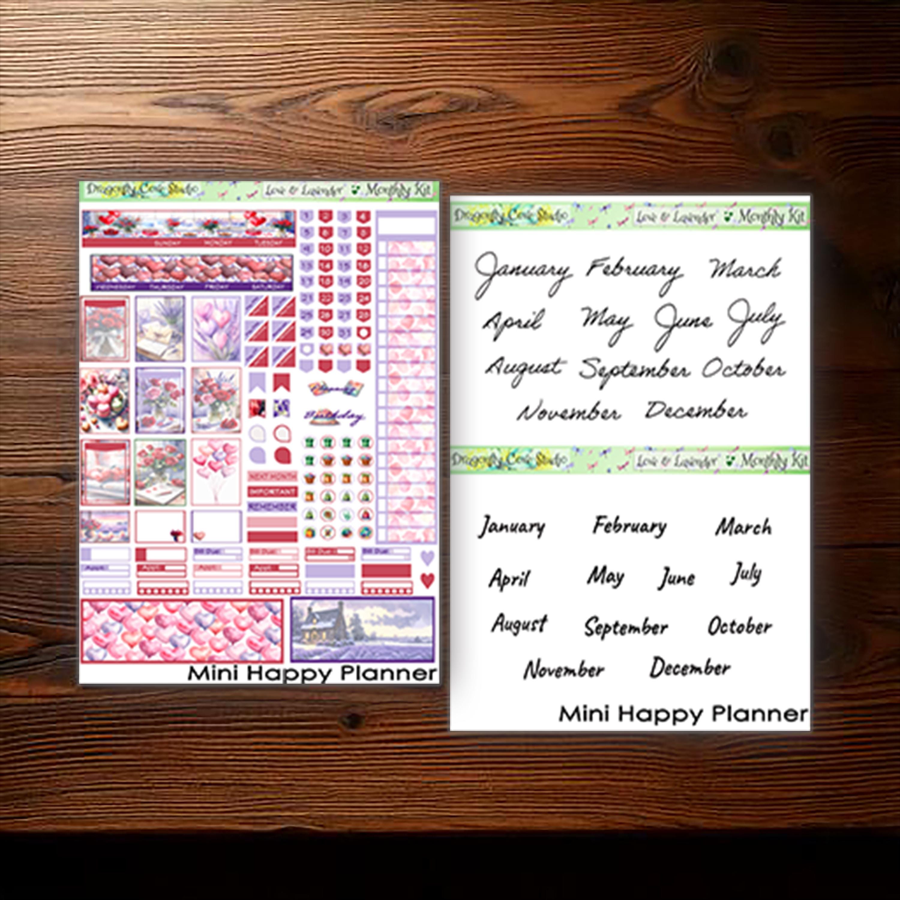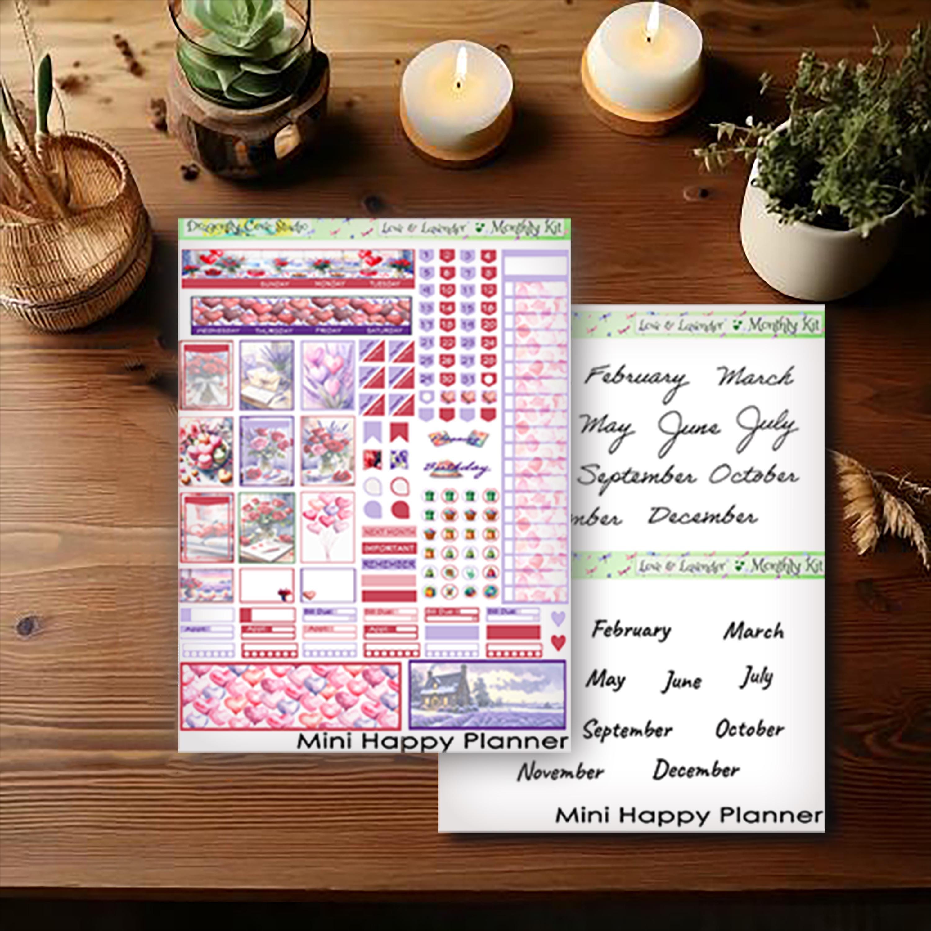 Mini Happy Planner Printable Stickers Monthly Kit | Love & Lavender Valentine | Planner Stickers Kit | PDF, Silhouette, Cricut Cut Files