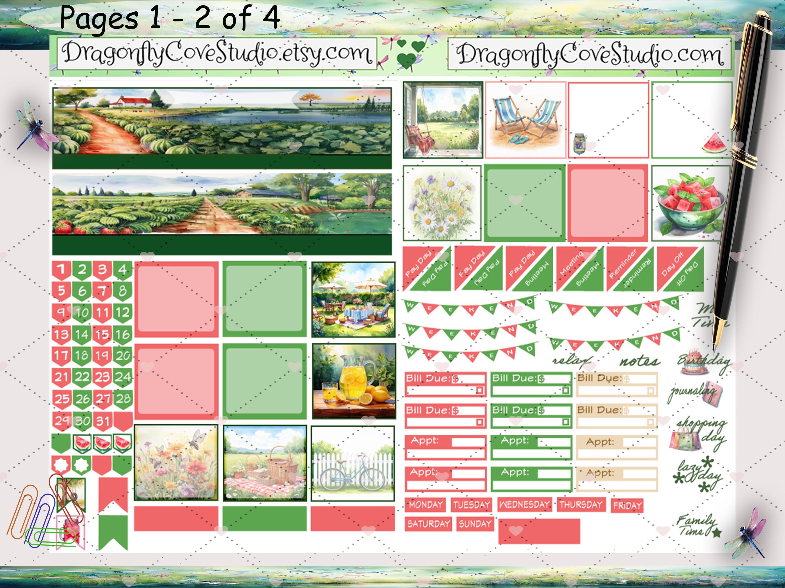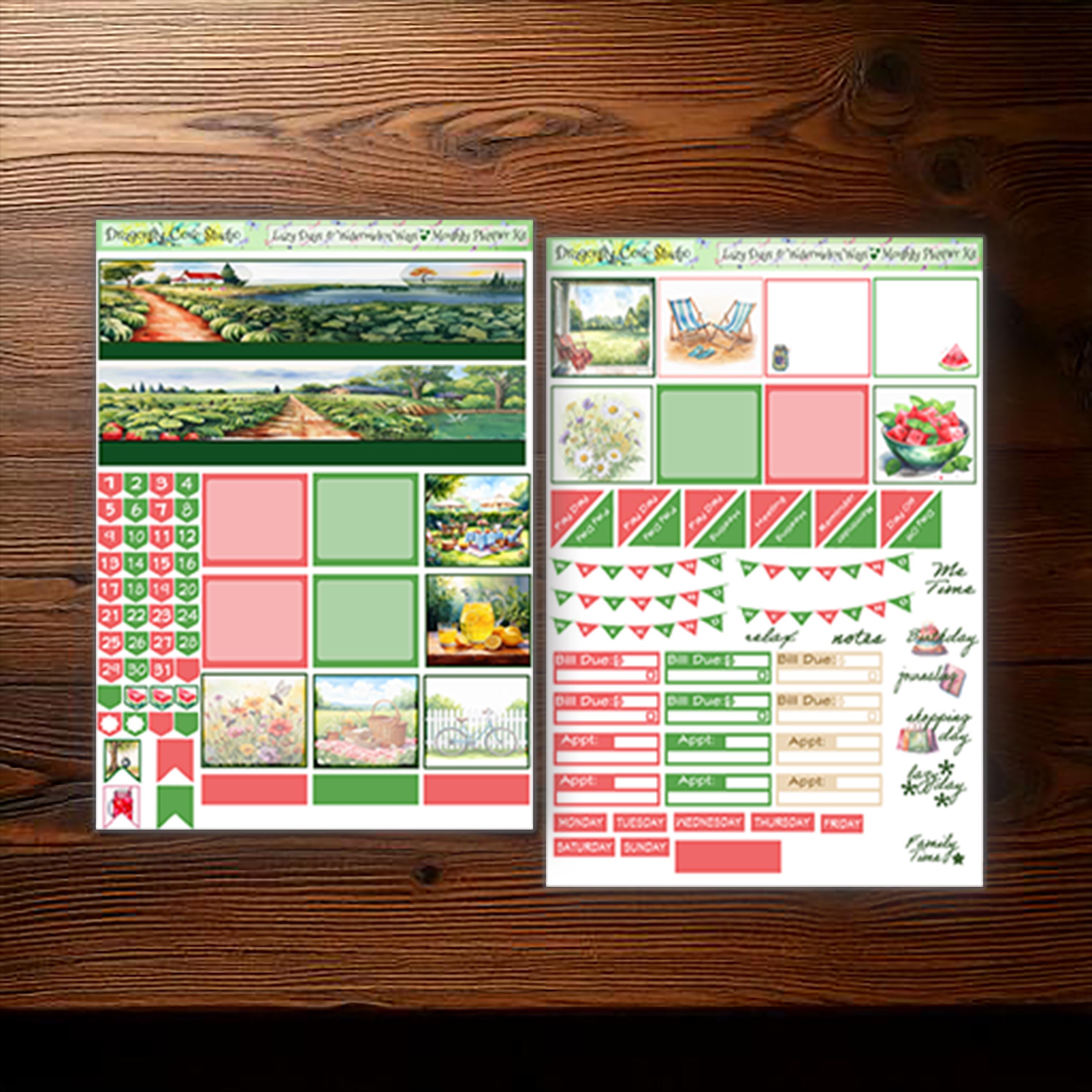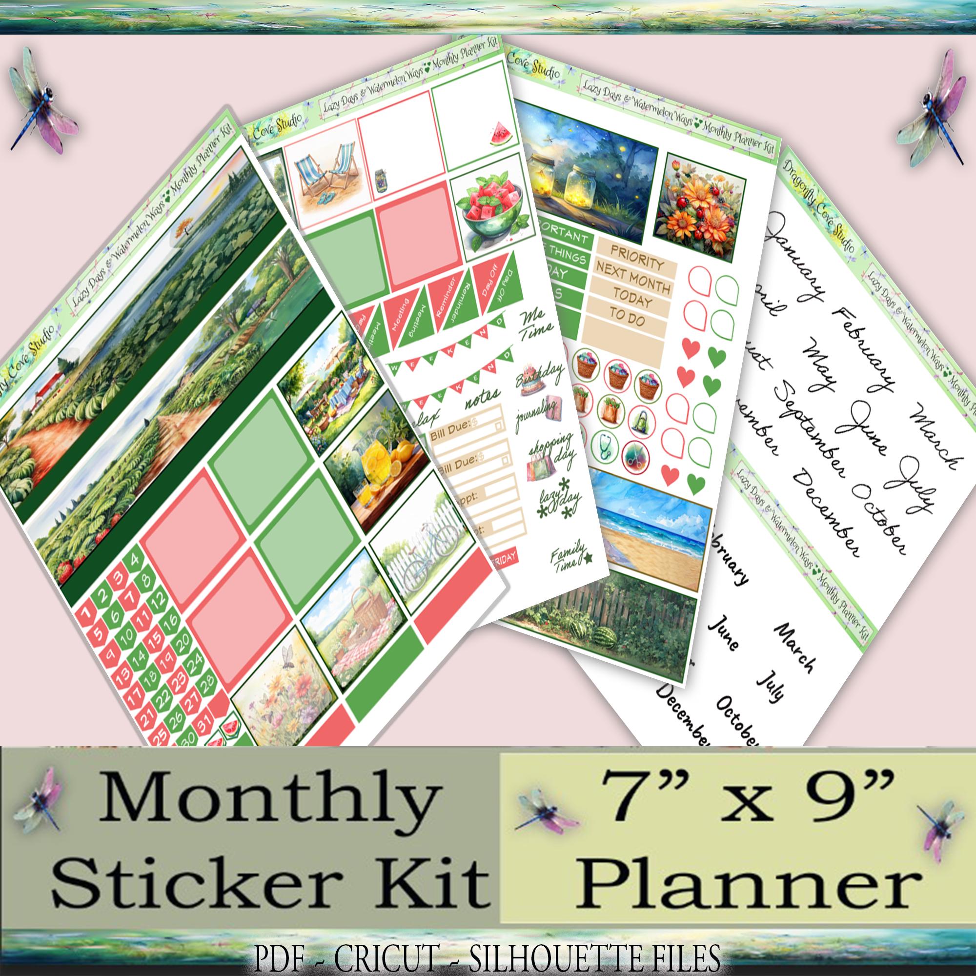 7x9 Planner Printable Stickers Monthly Kit | Lazy Days & Watermelon Ways | Silhouette, Cricut Cut Files + PDF
